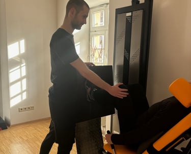 Therapeutische Behandlung mit forciertem Zug am jeweiligen Gelenk (oft Wirbelsäule), um den Druck lokal zu reduzieren und Schmerzen zu lindern.